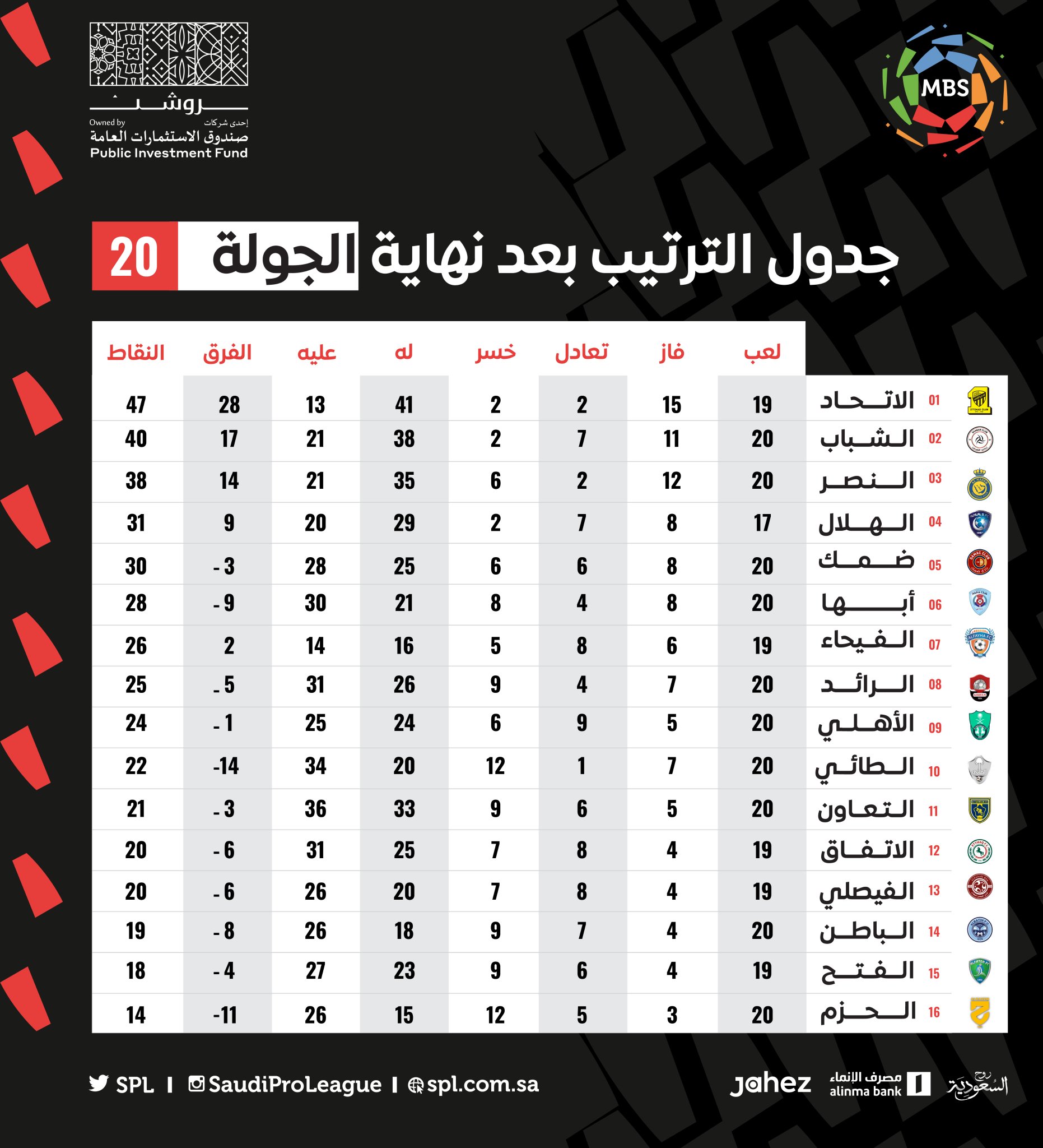 وبعد انتهاء الجولة الـ20 بدوري للمحترفين، حافظ فريق الاتحاد على صدارة البطولة برصيد 47 نقطة، ويليه نادي الشباب ثانيًا برصيد 40 نقطة، فيما جاء النصر في المركز الثالث بـ38 نقطة، وجاء الهلال رابعًا برصيد 31 نقطة، وضمك خامسًا برصيد 30 نقطة.